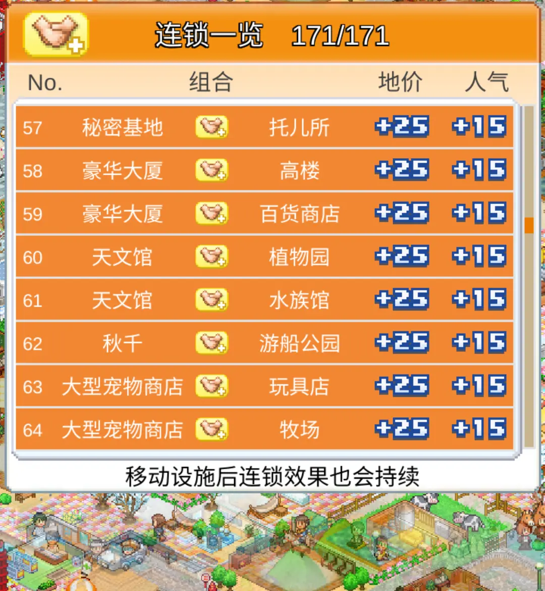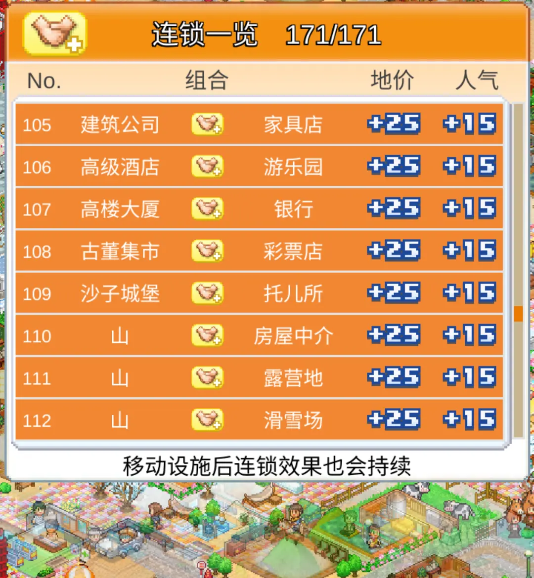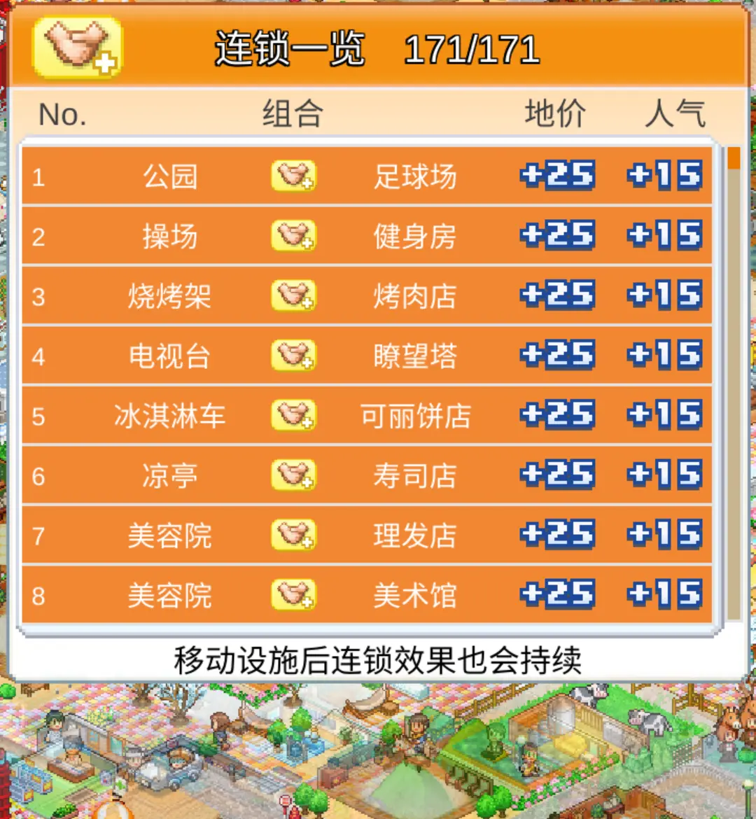 每个组合的效果均为:价值 +25、人气 +15(组合即使移动设施后仍有效)。