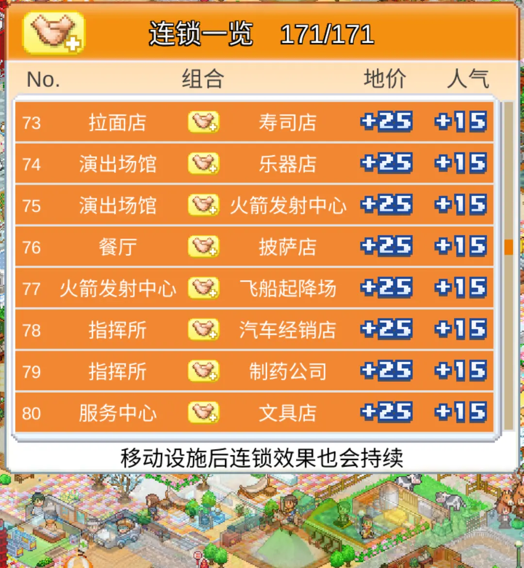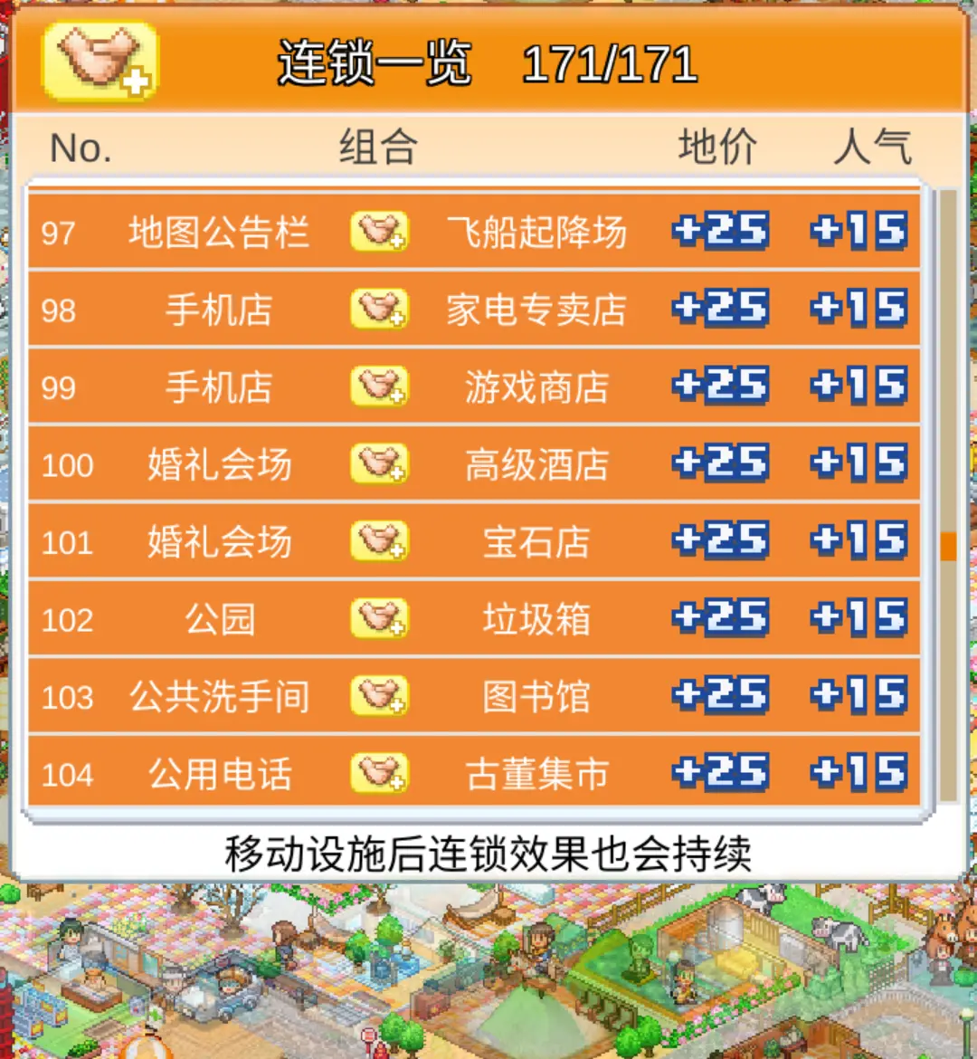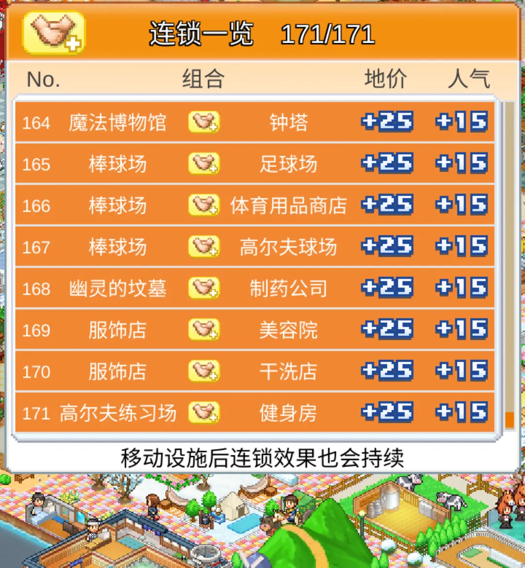 每个组合的效果均为:价值 +25、人气 +15(组合即使移动设施后仍有效)。